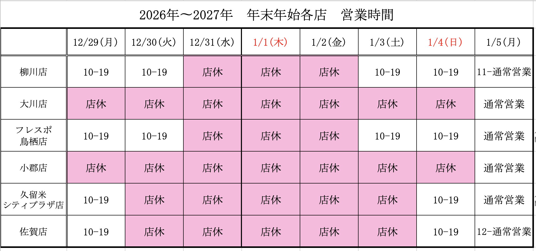 By ogawa Posted 2025年12月30日 In お知らせ, 久留米シティプラザ店, 佐賀店, 大川センター, 小郡センター, 小郡店, 店舗, 柳川店, 鳥栖店 【全店・お知らせ】2025年〜2026年 各店年末年始の営業時間について2025-12-302025-12-30https://ogawagakki.co.jp/wp-content/uploads/logo-main-ogawa.png人と音楽の素晴らしい出会いをつくる『小川楽器株式会社』https://ogawagakki.co.jp/wp-content/uploads/logo-main-ogawa.png200px200px 2025年も当店をご利用いただき、ありがとうございました。 2026年も、どうぞ宜しくお願いいたします。 年末年始の営業時間については下記をご参照ください。